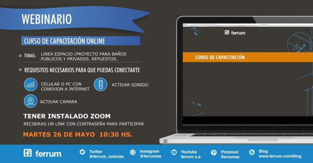 Estimados colegas: para el martes 26 de mayo, a partir de las 10:30 hs (minutos antes se enviará el link con la contraseña) programamos con la empresa Ferrum, una clase virtual de 1 hora de duración, sobre : «PROYECTO DE BAÑOS PARA DISCAPACITADOS «.