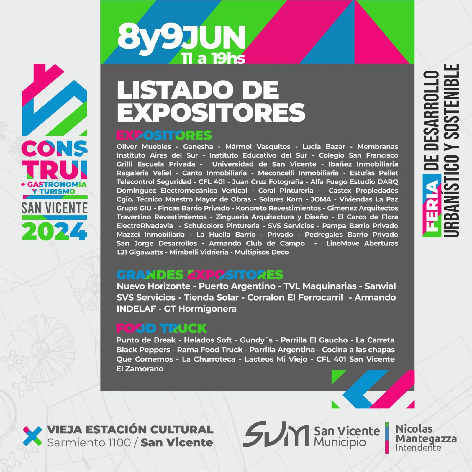 El Municipio de San Vicente nos ha invitado a participar los días 8 y 9 de Junio en el horario de 11 a 19 hs. a la Expo Construí San Vicente + Gastronomía y Turismo, por lo que tenemos el agrado de hacerles extensiva dicha invitación.