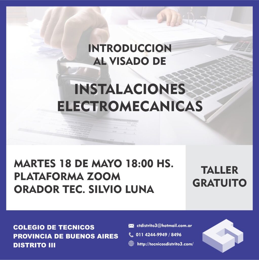 El día Martes 18 a las 18 hs. se dictará una charla virtual introductoria al visado de la especialidad de Instalaciones Electromecánicas por la plataforma ZOOM.