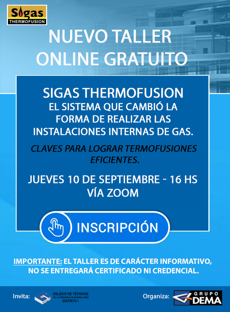Este próximo Jueves 10 de Septiembre 16 hs. Victor Cavagna estará dictando el Taller Sigas Thermofusion con título : «El sistema que cambió la forma de realizar las instalaciones internas de gas. Claves para lograr termofusiones eficientes»